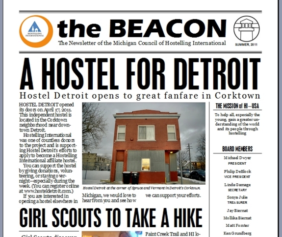 The Michigan Council of Hosteling International gives me a chance to try new things. I sit on the board and oversee the communications/marketing committee. As such I’ve cranked out a couple newsletters. My fellow board members provide most of the content, but they let me handle the design. Here’s a screenshot, but I will be posting the PDFs soon.